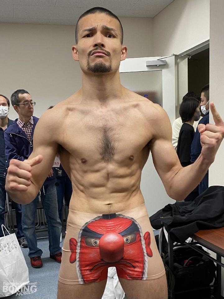 先に秤に乗ったアオキは、スーパーライト級リミットちょうどの63.5kgでクリアした。「後援会の方にプレゼントしてもらったので」と、天狗の絵が描いてあるパンツを履いて計量に臨んだ。