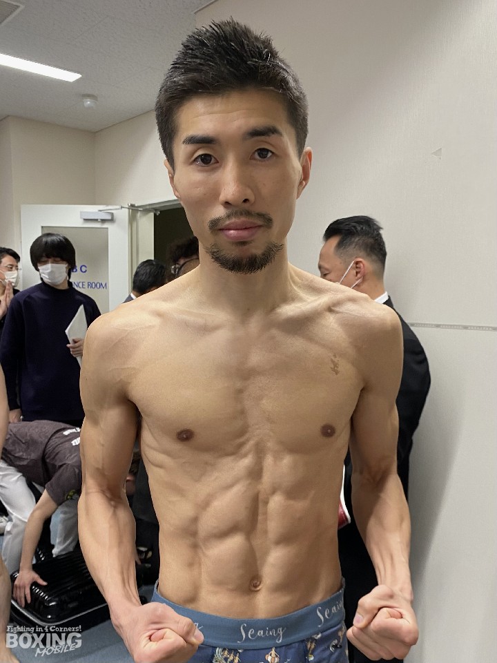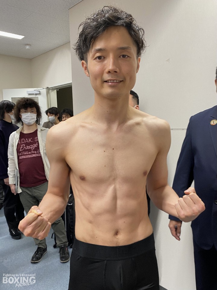 先に秤に乗った山中は、ライトフライ級リミットちょうどの48.9kgでクリアした。22戦目で初の後楽園ホールのリングに上がる山中は、「初めての後楽園ホールで緊張すると思うが、それも頭に入れて戦う。妹(山中菫)が良い内容で勝っている場所なので、自分もそれに続きたい」と意気込んだ。
