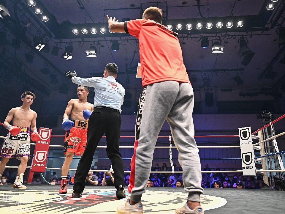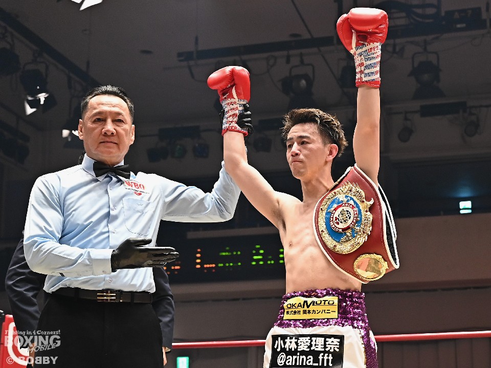 初回こそエコの左右ロングフックに面食らった小林だが、2回になるとジャブからワンツー、左ボディを痛打。さらに左フックでグラつかせた。勝負が決まったのは4回。小林はボディにパンチを集めると、エコ陣営が棄権を申し出た。