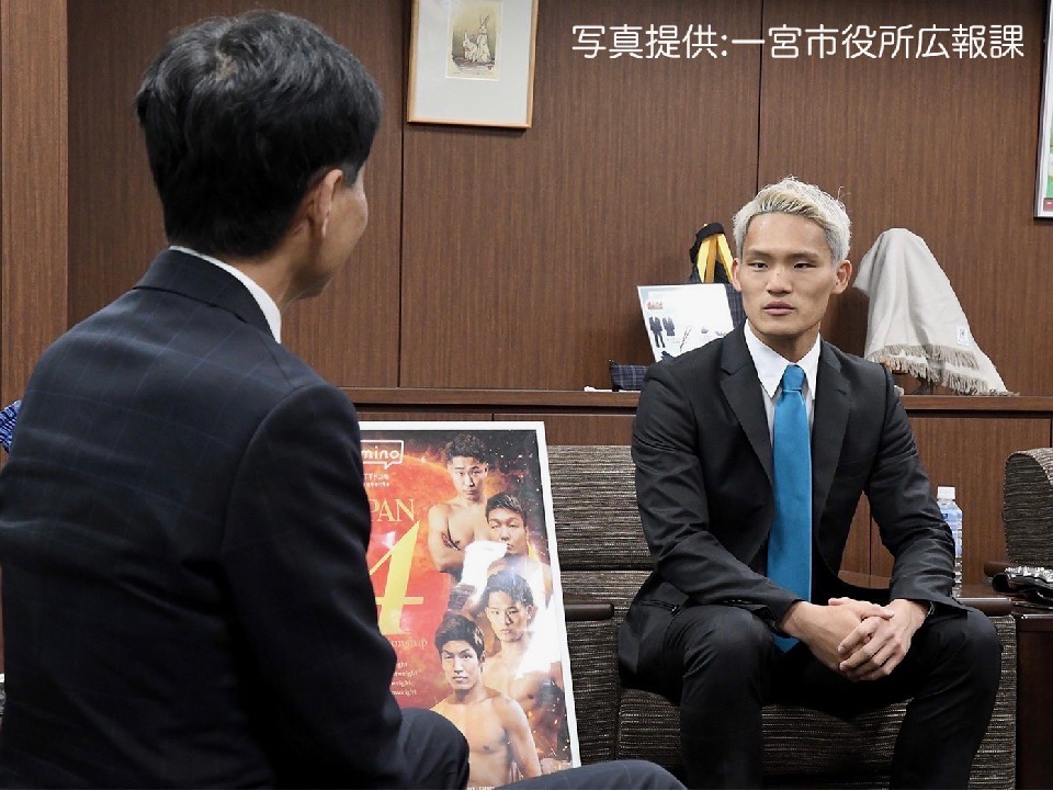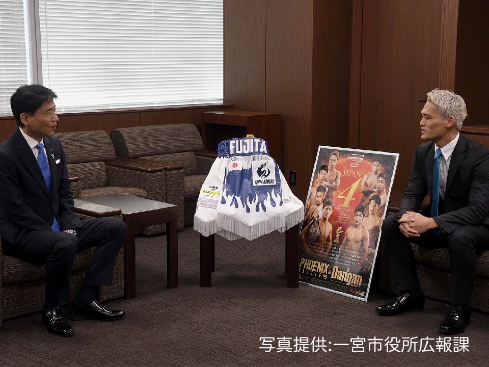 日本スーパーライト級王者の藤田炎村(28=三迫)が8日、愛知県一宮市役所を訪れて中野正康市長(56)にベルト獲得を報告した。