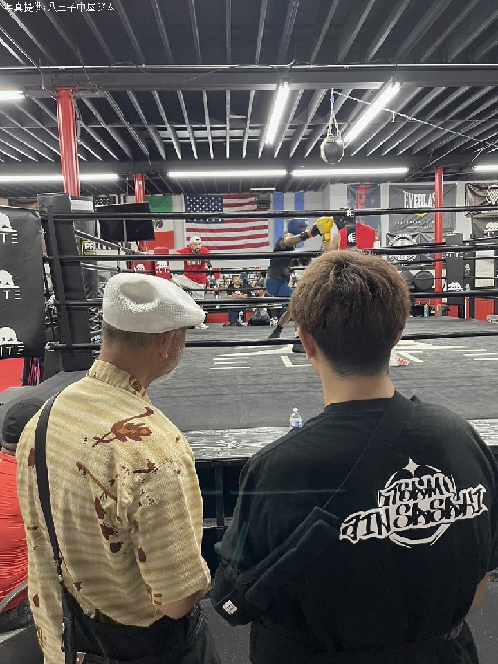 日本時間7月30日(日)にラスベガスで世界ウェルター級4団体王座統一戦(エロール・スペンスJr対テレンス・クロフォード)を観戦した佐々木は、翌日、ロサンゼルスに移動。中谷のスパーリングを見学し、技術面でのアドバイスや海外合宿の注意点などを聞いた。