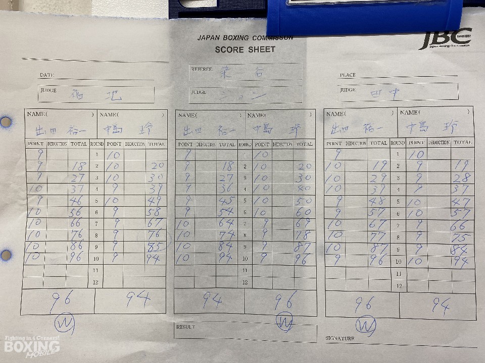 初回から出田が距離を潰してボディにパンチを集めると、中島は真っ向から応戦。豊富な手数を繰り出す出田と、左フック、左アッパーと有効打を決める中島の構図が続いた。前半終了時の公開採点は、49-46(中島)、50-45(中島)、48-47(出田)と割れたが、中島がリード。6回以降も出田はしつこく前に出て、細かいパンチを繰り出すと、中島は次第にスタミナを削られた。中島は単発の左フックを決めるが、出田は気持ちを切らさず、ワンツー連打で猛追。最後まで果敢に打ち合った。ジャッジ2者の支持を得た出田の手が挙がった。
