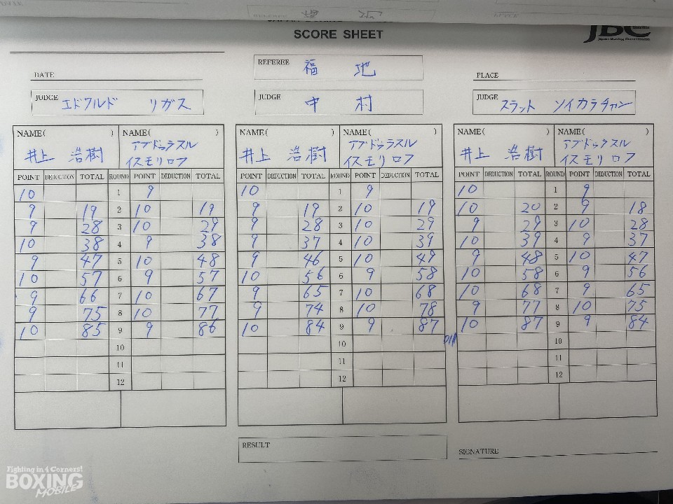 ラウンド毎にスイッチを繰り返すイスモリロフに対し、サウスポー井上は左ボディストレートで対抗。「スイッチがやりにくくて、考えすぎてしまった」(井上)。一進一退の攻防を繰り広げた。中盤は、イスモリロフが力強いパンチで見栄えの良さをアピール。8回、イスモリロフは左ボディから左右フックを叩きつけて攻勢。ピンチの井上だが、9回に距離を潰して打ち合うと、右ボディからショート連打で猛追。10回、井上は右ボディでダウンを奪うと、連打でダウンを追加。最後は、右フックでイスモリロフをキャンバスに沈めた。