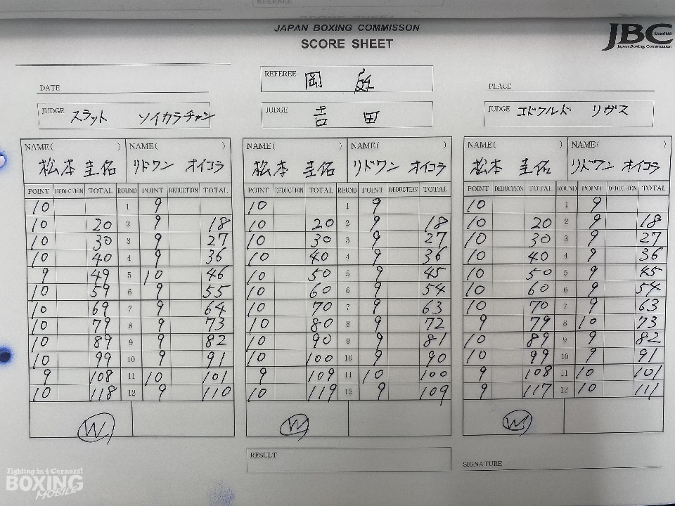 ジャブの差し合いで始まった試合は、松本が右ストレートを好打し、先制攻撃。緩急をつけたコンビネーションで、ポイントを加点した。5ラウンド終了時の公開採点は、49-46×1、50-45×2で松本がリード。中盤も、松本は左ボディを軸に攻め立てて、ペースを渡さず。ディフェンシブなオイコラを攻め立てた。11回、オイコラはプレスをかけてワンツーを好打。しかし、逆転するまでには至らなかった。終始、主導権を握り続けた松本が大差判定勝ちした。