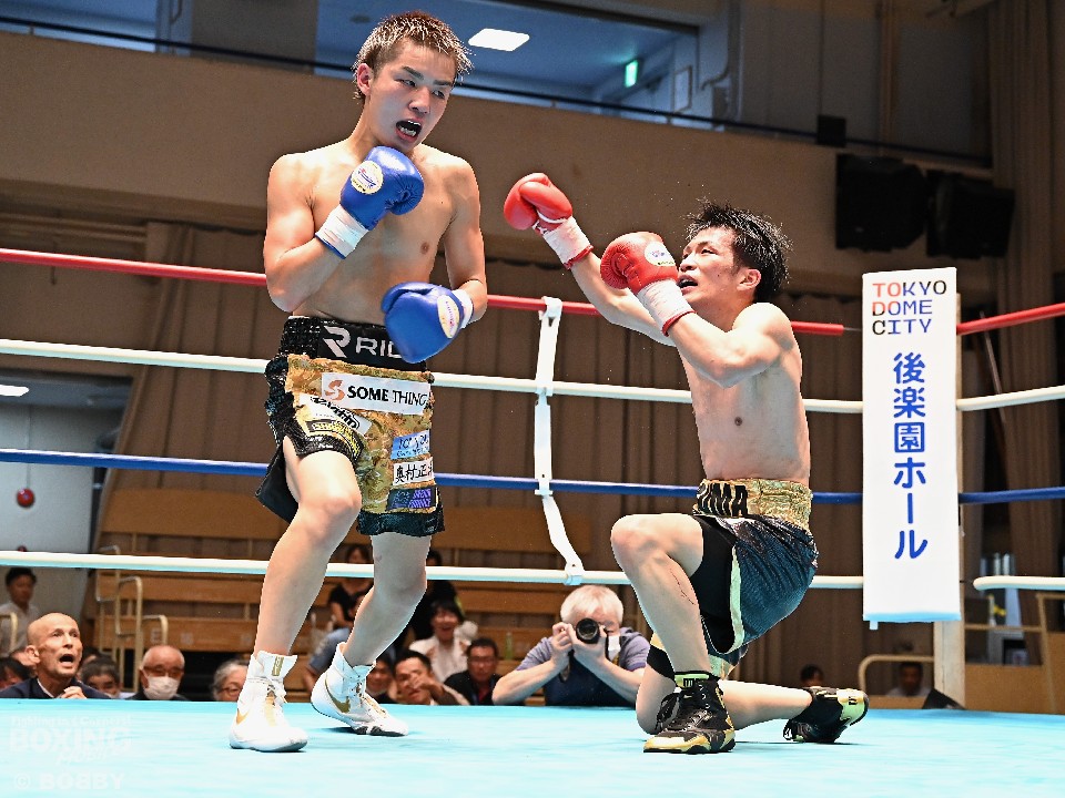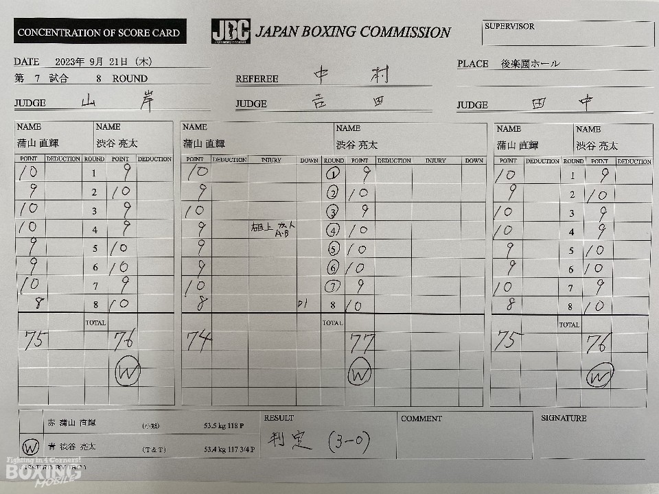 初回は先制攻撃を受けた渋谷だが、2回に右クロスでガクッと腰を沈めさせると、右アッパーを追撃。3回以降は、接近戦で体力を削り合った。6回、渋谷はワンツーで顔を弾くと連打で攻勢。しかし、7回は蒲山が上下に打ち分け、ジャッジに見栄えの良さアピール。蒲山が粘り強さを発揮した。8回、渋谷は右カウンターでダウンを演出。怒涛の連打を繰り出したが、蒲山も最後までパンチを返した。ダウンを奪った渋谷が接戦を制した。