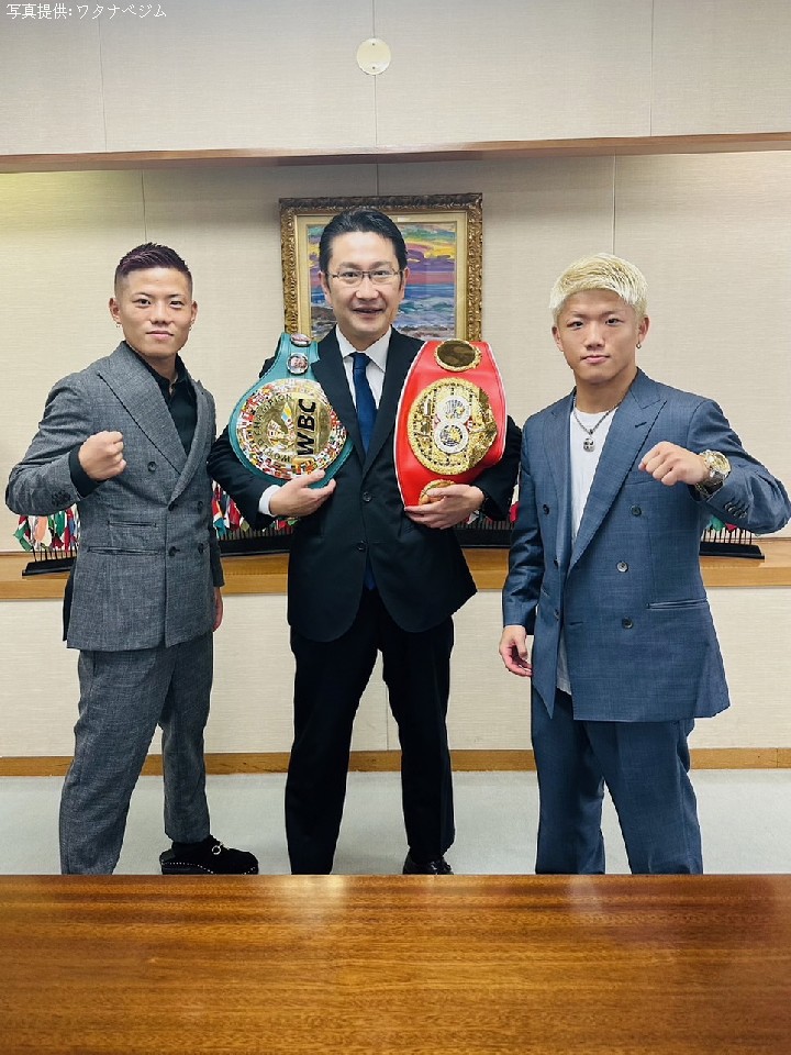 WBC(世界ボクシング評議会)ミニマム級王者の重岡優大(25=ワタナベ)とIBF(国際ボクシング連盟)ミニマム級王者の重岡銀次朗(23=ワタナベ)が12日、蒲島郁夫県知事と中垣内隆久副市長に世界戦の勝利を報告し、ベルトを披露した。重岡兄弟は「近いうちに4つベルト持って帰ってきます」と、兄弟でのミニマム級4団体王座統一を約束した。