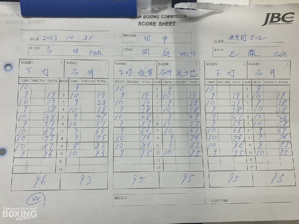 最後まで目が離せない日本タイトルマッチにふさわしい名勝負だった。初回、サウスポー下町の左ストレートを浴びた石井だが、2回に距離を詰めて左ボディを突き刺し反撃。その後は、下町が左ストレート、接近戦での左ショートアッパーを決めれば、石井もフィジカルの強さを活かし、ワンツー左ボディをねじ込み譲らず。前半終了時の公開採点は、48-47×2(下町)、48-47×1(石井)と割れた。6回、ギアを上げた石井はグイグイと攻め立てたが、7回は下町が盛り返す。会場は割れんばかりの大歓声だ。8回、下町はワンツー右フックを好打すると、9回に左ストレートから連打で攻勢。ダメージが溜まってきた石井だが、最終10回に手数を増やしてポイントを奪った。ジャッジ1者は下町を支持したが、残り2者は引き分けとした。