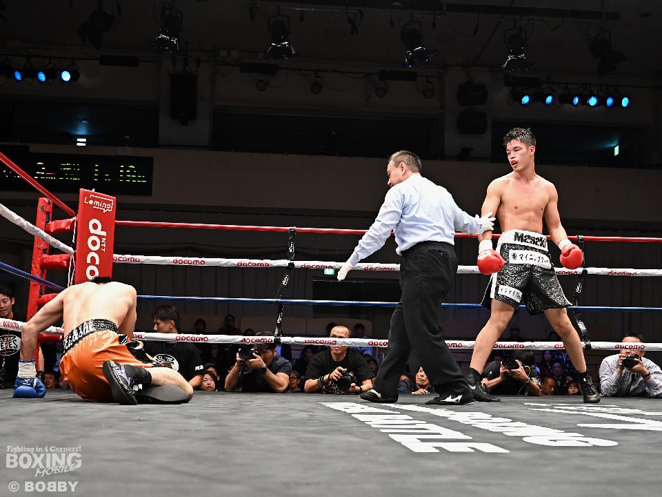 サウスポー加藤が前の手でタイミングを図りながら、左ストレートを狙うのに対し、小林は右ストレートで対抗。2回、加藤は右フックで膝を揺らすと、左ストレートを決めてリズム感のある攻撃を披露。ペースを掴みかけた。しかし、勝負は3回に決まる。小林がプレスをかけながら、左フックでダウンを演出。再開後、コーナーに詰めて連打を浴びせると、防戦一方になった加藤を見て、レフェリーが割って入った。