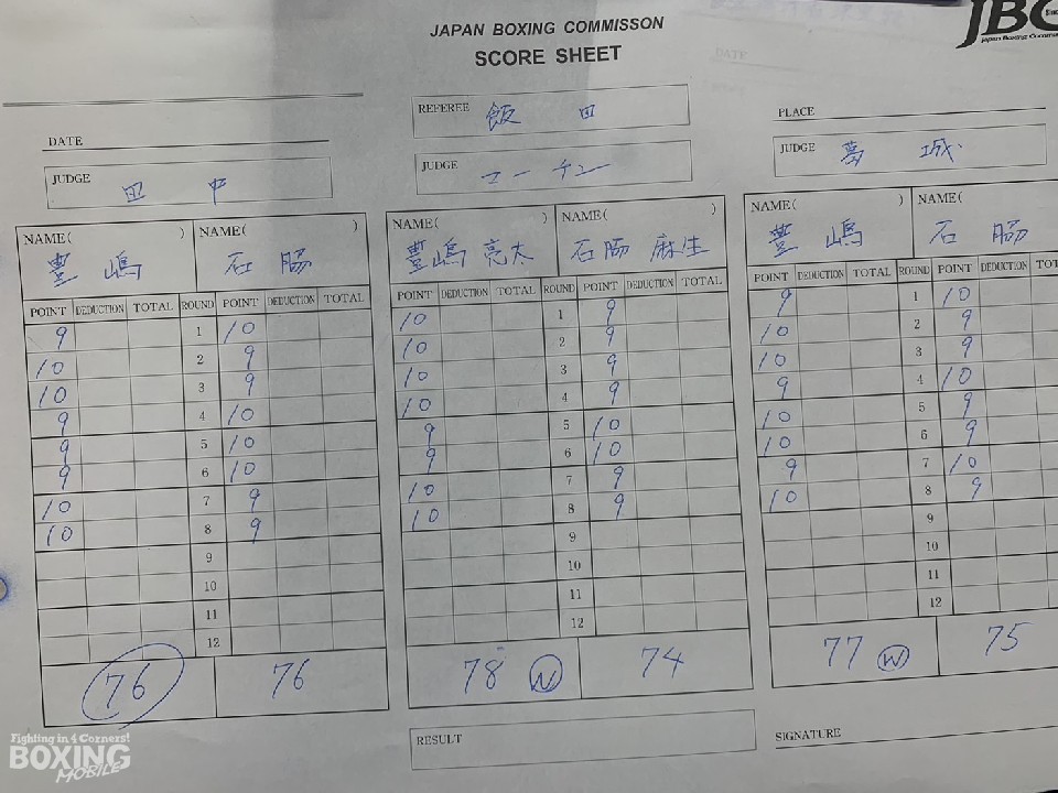 豊嶋がジャブからワンツーにつなげてプレスをかけるのに対し、石脇はリターンの左ボディで対抗。中盤はボディへの削り合い。6回、石脇が左ボディ、左フックを好打し、見栄えの良さをアピール。それでも豊嶋は大きく崩れることなく、積極的な攻撃で終盤を抑えた。ジャッジ2者の支持を得た豊嶋に軍配が上がった。