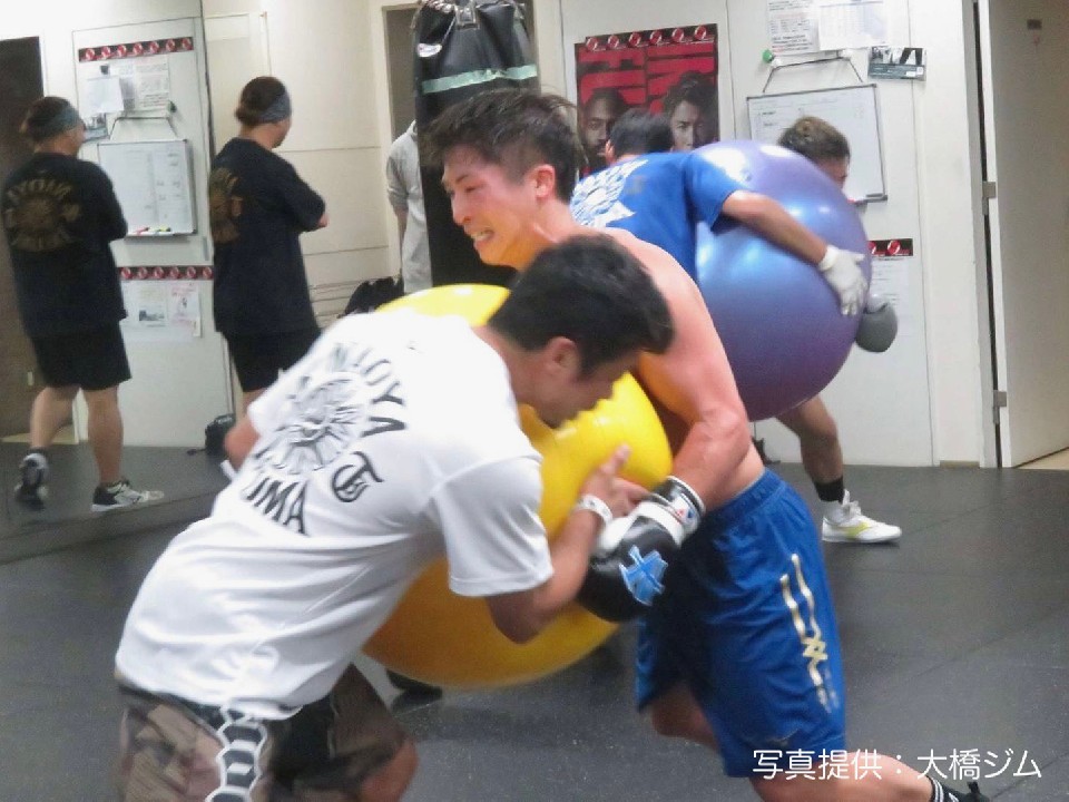 サンドバッグ連打(15秒間)、腕立て+ジャンプしながらのシャドーパンチ4連打(20秒間)、八重樫トレーナーが構えるバランスボールの全力押し(10秒間)、1発ずつ強めのサンドバック連打(15秒間)の60秒を1セットとしたメニューを計5セット。その後は、太田光亮トレーナーとのミット打ちを3セット、最後は、全力でのエアロバイク漕ぎで締めた。