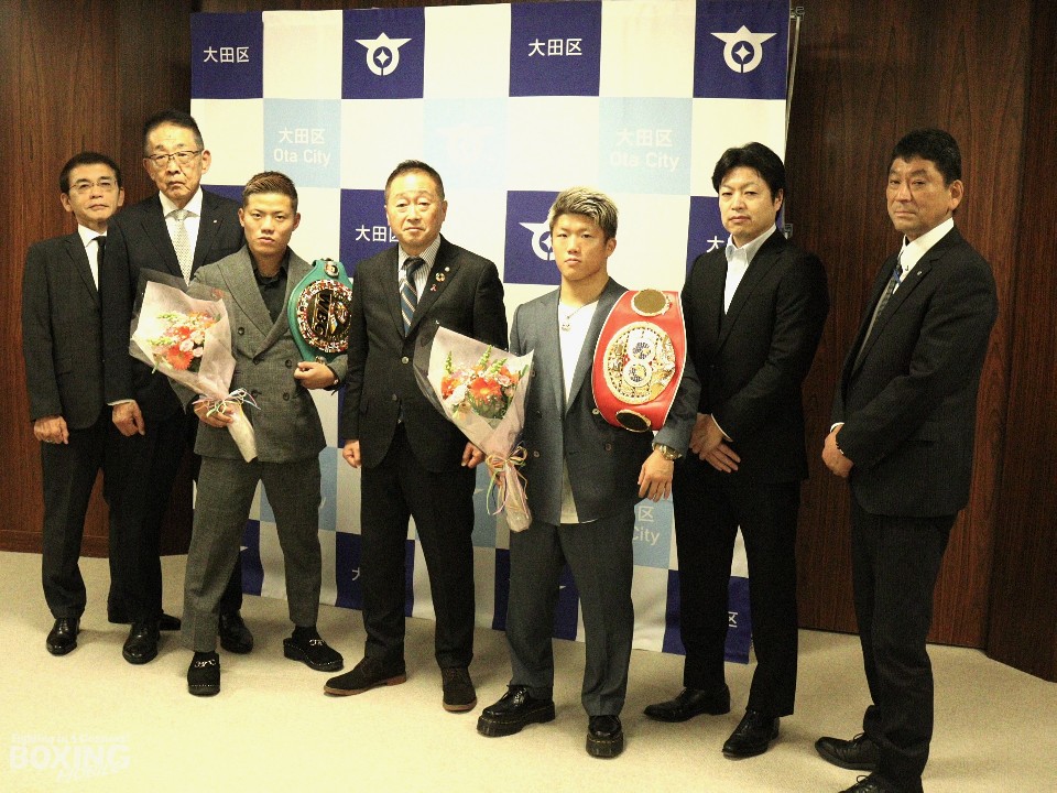 鈴木区長は「大田区総合体育館は、格闘技の聖地。そこからまたニューヒーローが誕生した。2人にはチャンピオンとして末永く活躍して、記録を塗り替えて、私たちに夢と希望を与えてもらいたい」と激励した。続けて、「大田区はトンカツや餃子が有名な店があるので、ぜひとも行ってほしい」と勧められると2人とも「ぜひとも行きたいです」と笑顔を見せた。