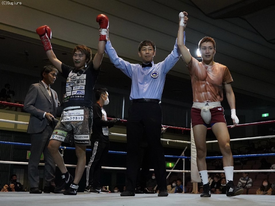 第7試合54.5kg契約6回戦では菅原健太(32=名古屋大橋)と長尾太我(27=SUN-RISE)が激突。初回に右カウンターでダウンを奪った菅原は、2回に長尾の右アッパーを浴びて反撃を受けたが、4回に連打から右ストレートでダウンを奪い、試合を決めた。