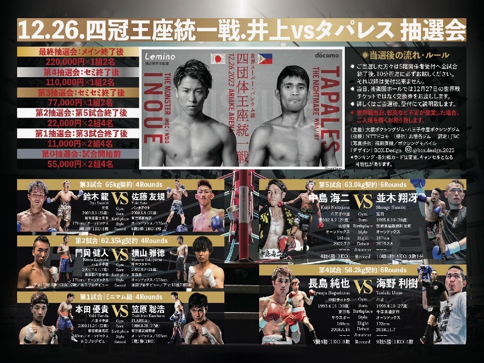 当日券も販売される明日の後楽園ホールでは、12月26日(火)に開催される井上尚弥(30=大橋)とマーロン・タパレス(31=比)によるスーパーバンタム級世界4団体統一戦の観戦チケットの抽選会も行われる。