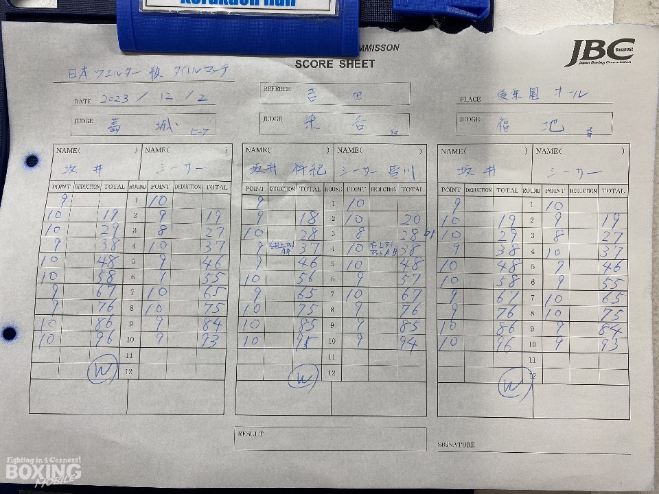 2度目の王座防衛に成功した坂井は「不意にアッパーをもらって効いたが、追撃は耐えることができたので、途中から最初の一発だけを気をつけた」と、ピンチにも動じなかったようで、「後半は負けていると思ったのか、相手が前に出てきたので、そこを上手く利用しながら戦った。途中採点でリードしていたので、(この戦いでいいと)気持ちが楽になった」と冷静に試合を振り返った。