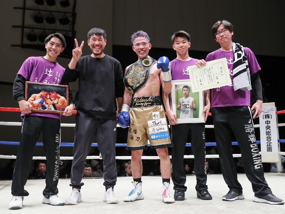 フェザー級の日本ユース王者のベルトを巻いた辻は「ありがとうございます。夢と思ってます。ランキングに入る自覚もないです」と喜びを爆発させた。同門の殿本恭平(28=勝輝)が巻いていたベルトを取り戻したことを報告した。