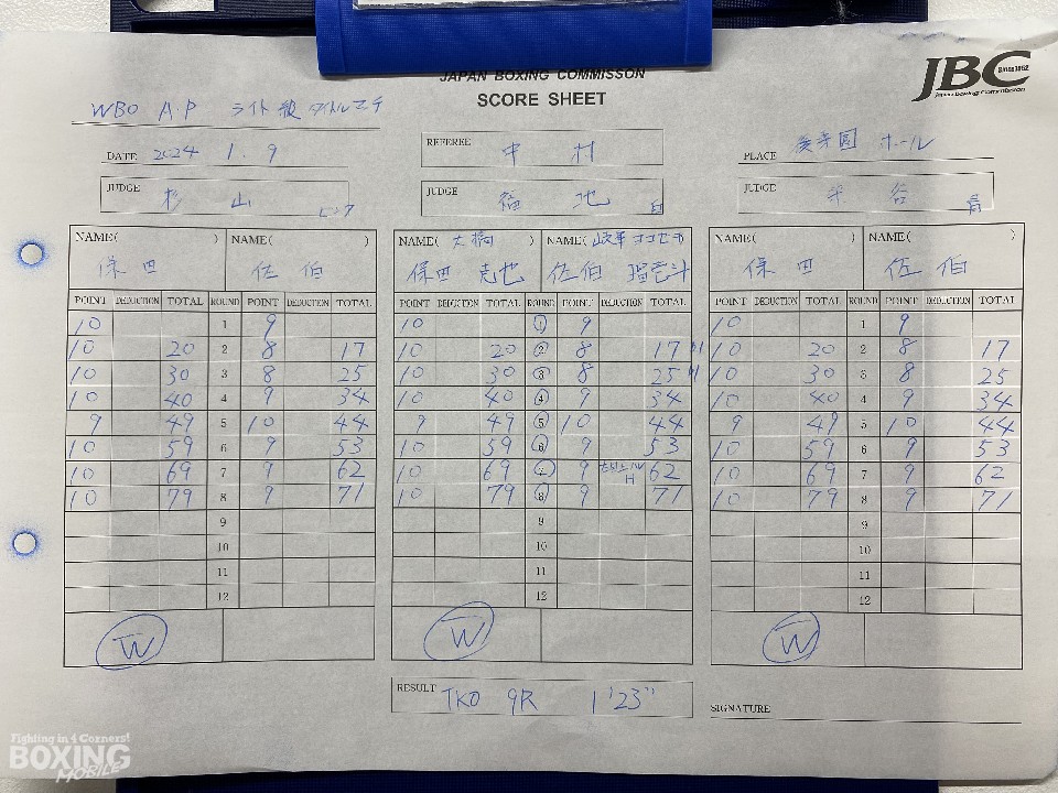 サウスポー保田が右フックを合わせるのに対し、佐伯はプレスをかけて右から切り込む形でスタート。2回、保田は右フックを振り抜くと、佐伯はキャンバスに転がり、レフェリーはダウンを宣告。3回、佐伯はボディにパンチを集めたが、保田は相手の右を外すと、左ストレートで2度目のダウンを奪った。5回、佐伯は手数を増やして反撃。しかし、保田は要所要所で左ストレートを好打。左目下を腫れさせた。9回、保田がワンツーを決めたところで、レフェリーが二人の間に割って入った。