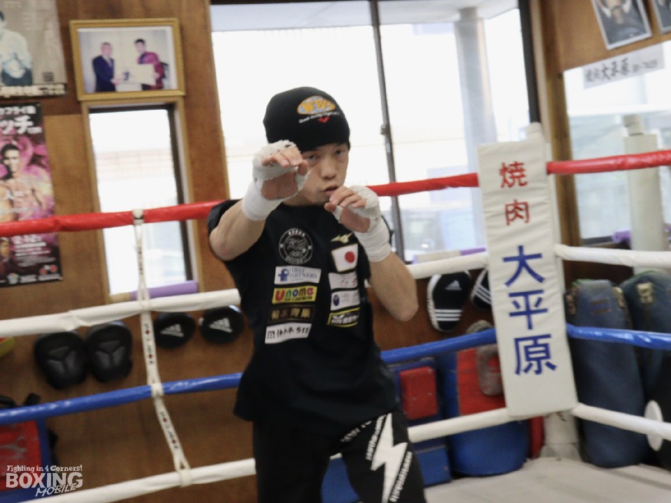会見後にはシャドーボクシングとミット打ち、サンドバッグ打ち、スティックミット打ちを見せた。3年前からコンビを組む村田大輔トレーナーとのミット打ちでは、一瞬の飛び込みとバックステップ、緩急をつけた動きからハンドスピードを活かした息の合ったコンビネーションを披露。早送りのような素早い動きから強烈なパンチを叩き込み、ジム内に快音を響かせた。