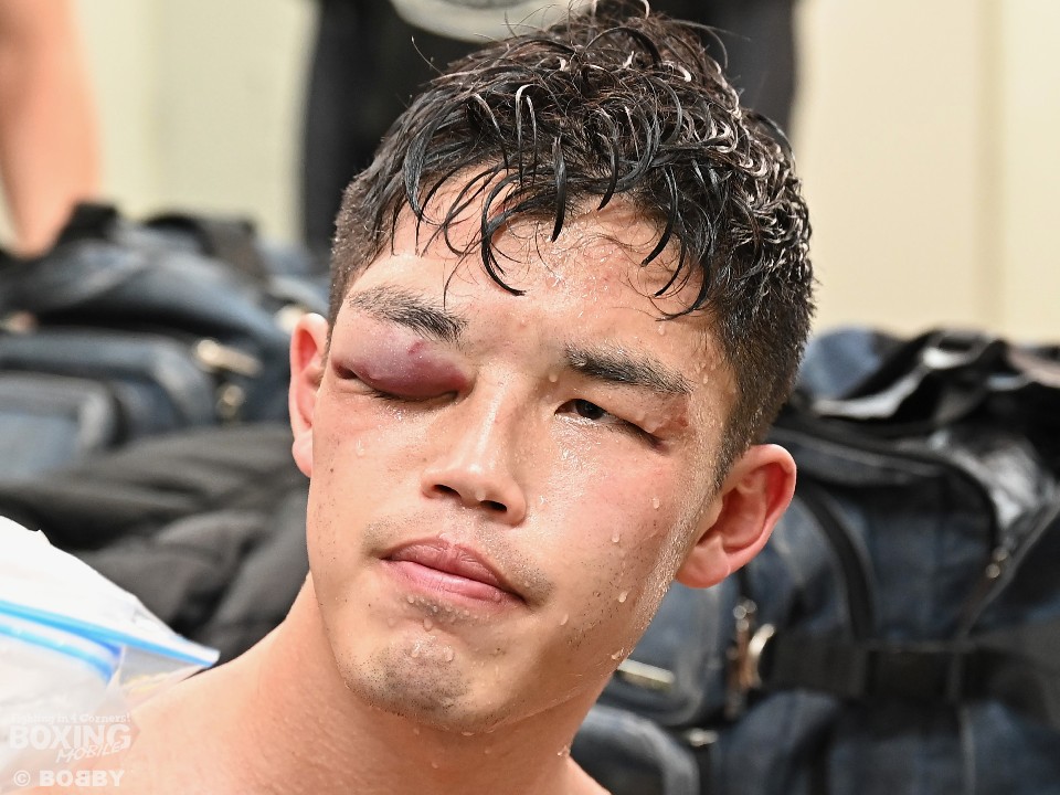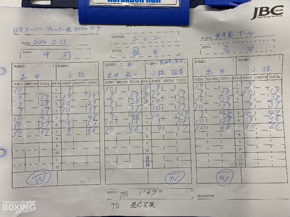 初回から小林が右フックを叩きつければ、出田はボディにパンチを集めて応戦。2回、小林は右ショートアッパーで顔を弾くと、右オーバーハンドを決めた。その後も出田が距離を潰してボディ攻撃を仕掛ければ、小林も押し負けずワンツーをヒット。小林は相手の頭が当たり左目上を腫らした。前半終了時の公開採点は48-47(出田)、48-47(小林)、49-46(小林)と挑戦者がリード。6回、さらに圧力を強めた出田が攻勢。7回、出田はロープに押し込み、連打でジャッジに優勢をアピール。その後、小林の左目上の腫れがひどくなり、勝負は負傷判定へ。ジャッジ2者の支持を得た出田が王座を死守した。