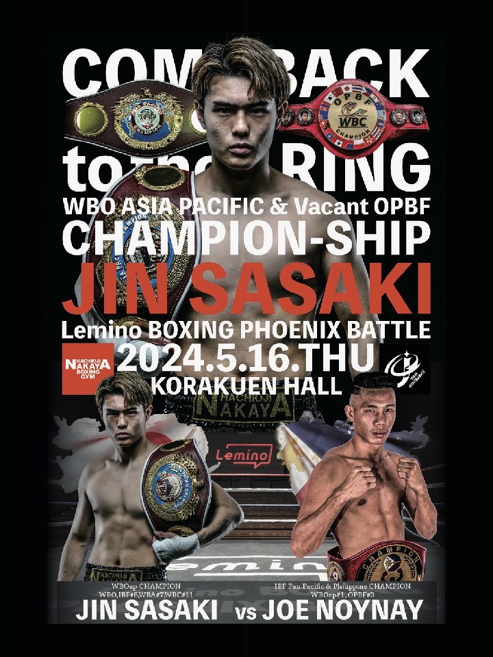 佐々木は、5月16日(木)、後楽園ホールで開催される「Lemino BOXING」のメインイベントで、同級1位のジョー・ノイナイ(28=比国)を迎えて3度目の防衛戦に臨む。さらに空位のOPBF東洋太平洋王座も懸けられることとなった。