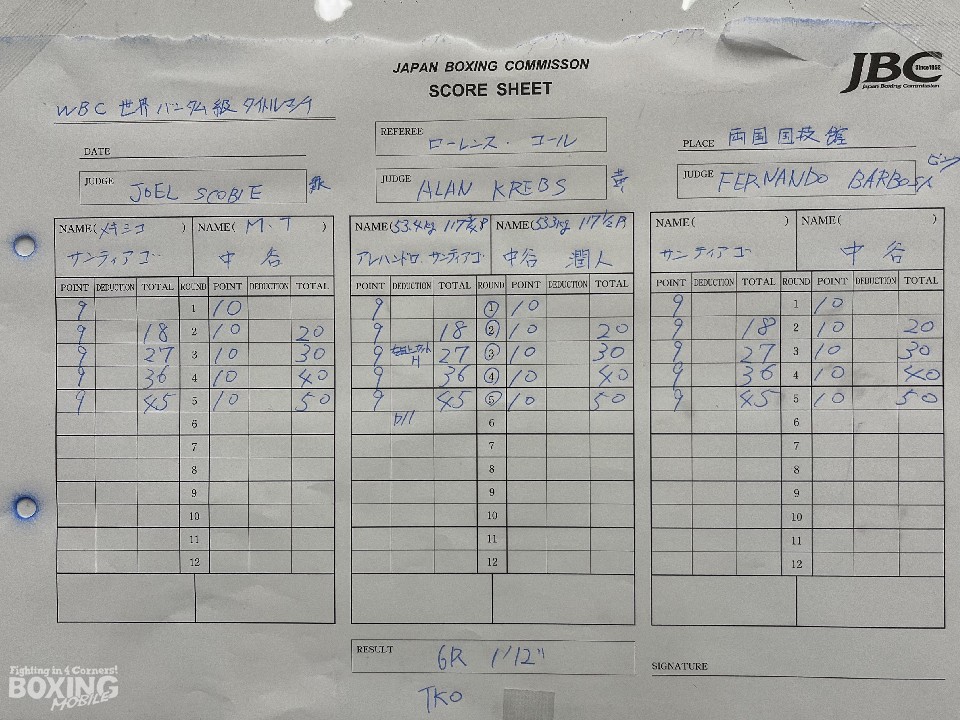 中間距離から踏み込むタイミングを探った両者。ダウンが奪える左の打ち分けに定評のある中谷が最初に見せたのは、アッパー。前に出てくるサンティアゴに対して、中谷はバックステップで対応した。サンティアゴの右ストレートと左フックも光った。4回にはサンティアゴの右アッパーが中谷の顔面をかすめた。4回終了時の途中採点は、ジャッジ3者ともに36-40で中谷を支持した。