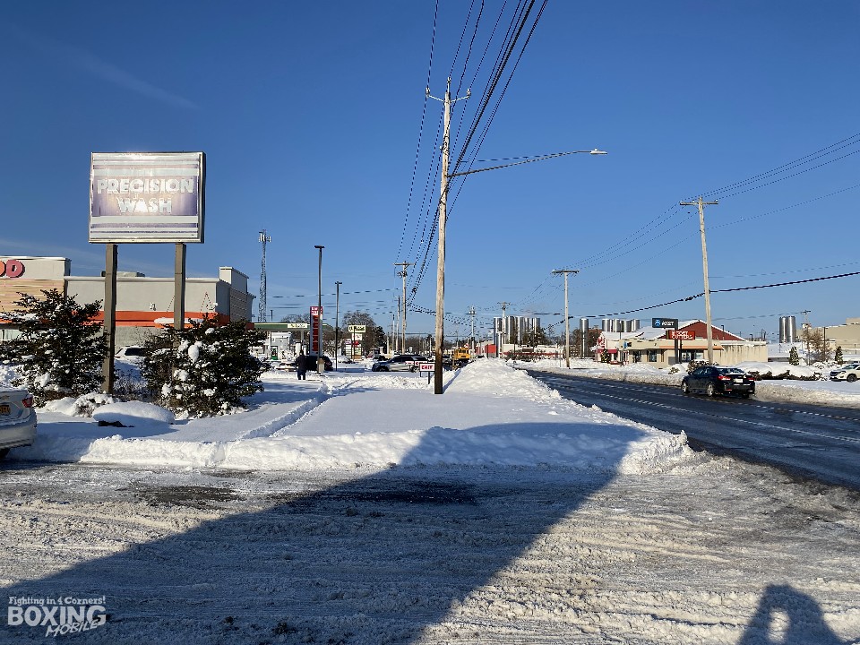 本日(1日)の最高気温は8℃、夜は1℃と冷え込むと予想されている。数日前に雪が降ったということで、10cmほど雪が積もっていた。極寒というわけではなく、やや寒い程度だ。ジェネシー通りに宿泊しているホテルがあり、周りにはミスタードーナツや、バーガーキング、マクドナルドといった飲食店がポツポツと並んでいる。人通りもまだ少ない。