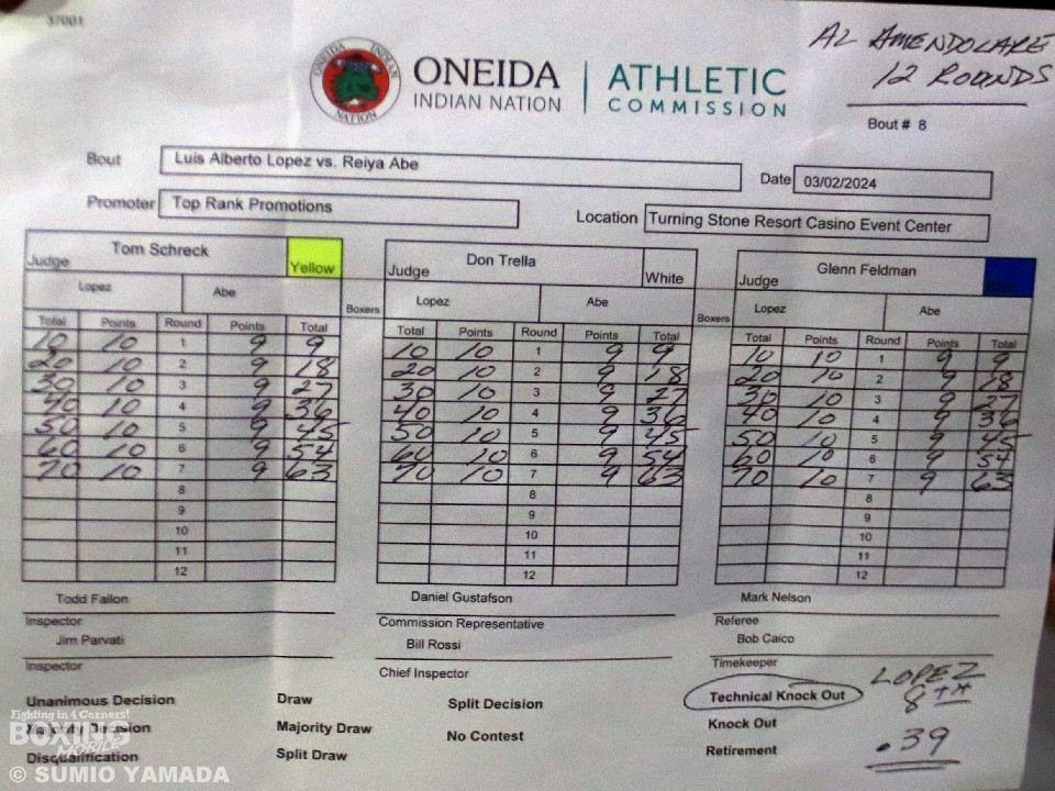 一方、3度目の防衛に成功したロペスだが右拳を痛めたようだ。ロペスは「彼は日本の魂を持った勇敢な戦士だ。目を怪我しても最後まで怯まずに挑んできた。彼をとてもリスペクトしている」と拳を交えた阿部を称えると、「2ラウンドに左フックで目を腫れさせたと思う。レフェリーがストップする可能性もあると思った」と冷静に試合を振り返った。