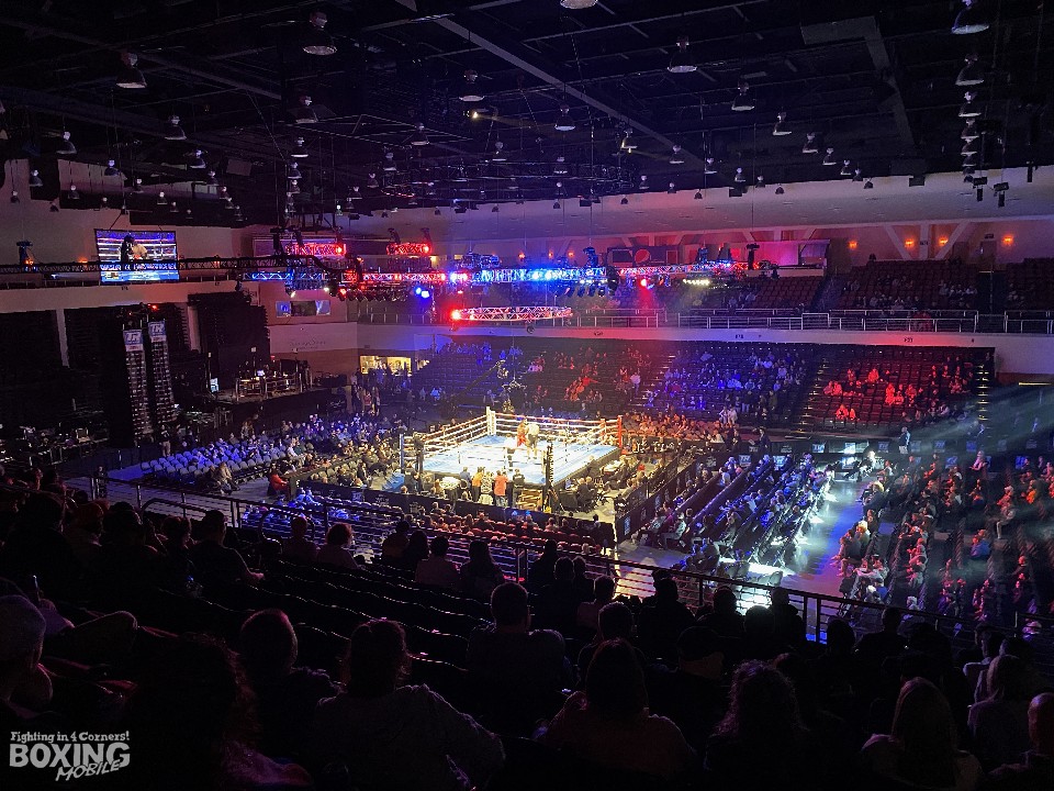 収容人数は約4000人、会場の規模は、東京・大田区総合体育館とほぼ同じ。観客席はすでに7割程度埋まっていて、2階席も徐々に空席が減ってきている。会場内の雰囲気は明るく、いいパンチが入ると、大きな声を出したり、指笛で盛り上げている。