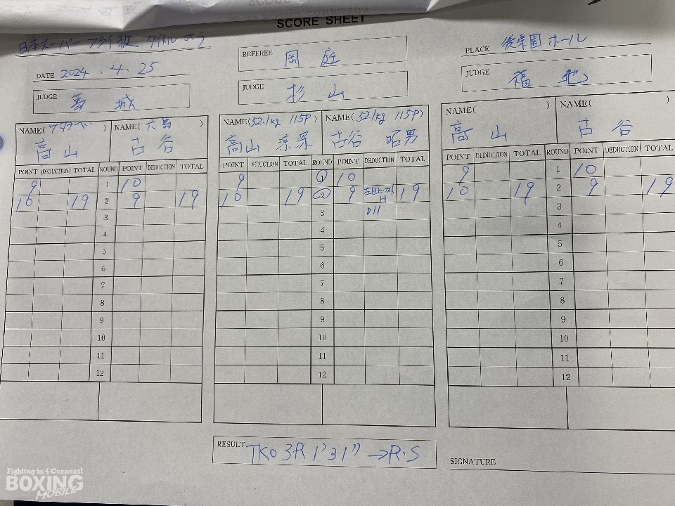 開始早々、古谷が右ボディストレートで先制攻撃を仕掛けると、左ボディを突き刺し、攻勢をアピール。2回、サウスポー高山は、上下に打ち分けて反撃するが、クリーンヒットを奪えず。なかなかエンジンがかからない高山だが、3回に左ストレートから右フックでダウンを演出。再開後、ダメージが残る相手に襲い掛かると、右フックで倒してレフェリーストップに持ち込んだ。