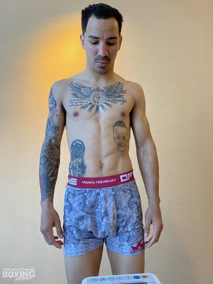 IBF(国際ボクシング連盟)バンタム級タイトルマッチ、王者のエマヌエル・ロドリゲス(31=プエルトリコ)対同級1位の西田凌佑(27=六島)の当日計量が4日、大阪市内のホテル日航大阪で行われた。