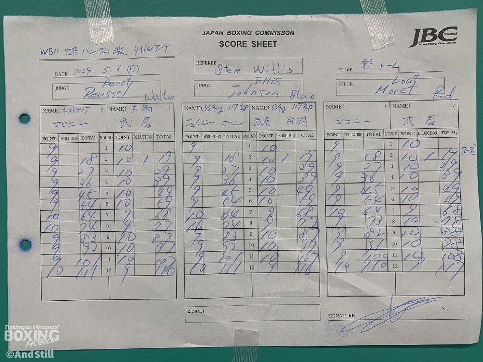 序盤から積極的に攻めて、上下にパンチを打ち分ける武居に対し、冷静にガードを固めカウンターでパンチを返すマロニー、そうした対照的な立ち上がりとなった。中盤は、互いにミドルレンジでパンチを交わし、主導権の奪い合いを展開に。徐々に武居のパンチがマロニーの顔面を捉え始める。終盤に差し掛かり、疲れが見えてきた武居に対し、初回からペースを変えずに攻め続けるマロニー。最終12回、マロニーの猛攻にダウン寸前まで追い込まれるも、死力を尽くしパンチを返す武居に、東京ドームは大歓声で揺れた。試合の決着は判定へ。ジミーレノンJr.が「And the New」とコールした瞬間、日本人100人目の世界チャンピオンが誕生した。