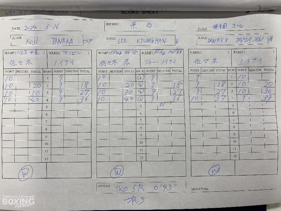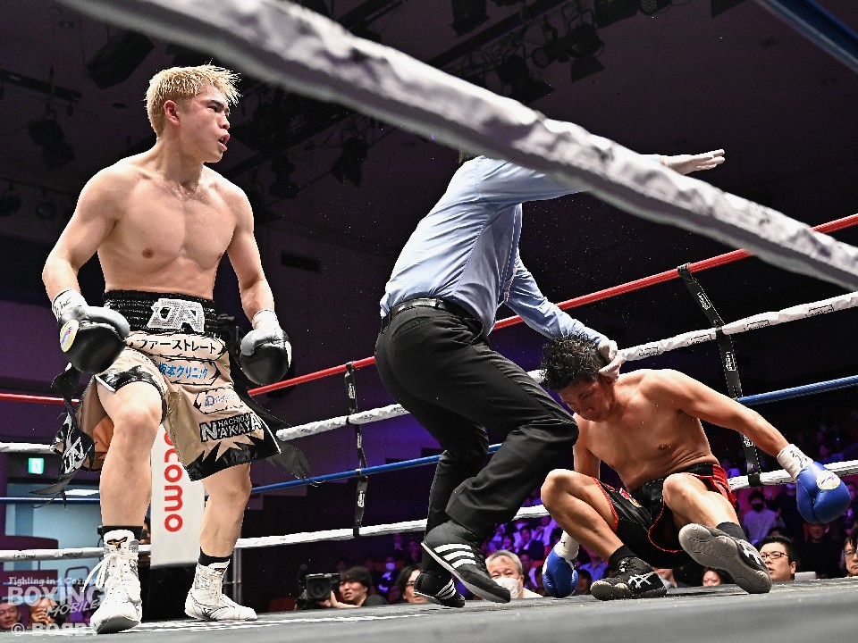 佐々木が左を大きく振り下ろして、プレスをかけるのに対して、サウスポーのノイナイは、左フックと左ショートアッパーで応戦。それでも、勢いが止まらない佐々木が、左フックから一気にパンチをまとめて、最後は右フックで顔面を打ち抜くと、レフェリーが飛び込んで試合を止めた。