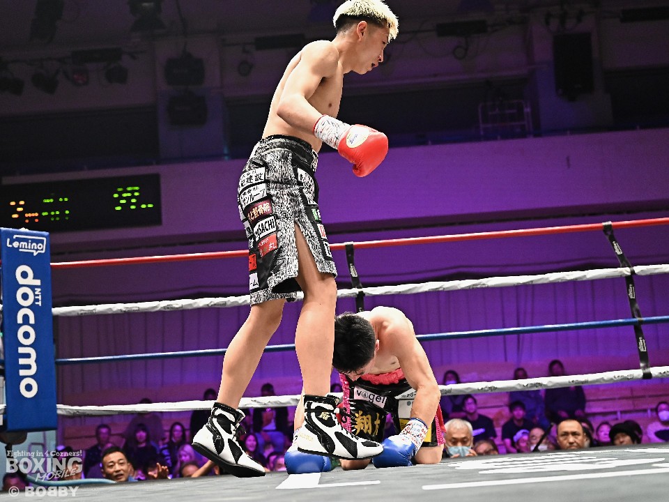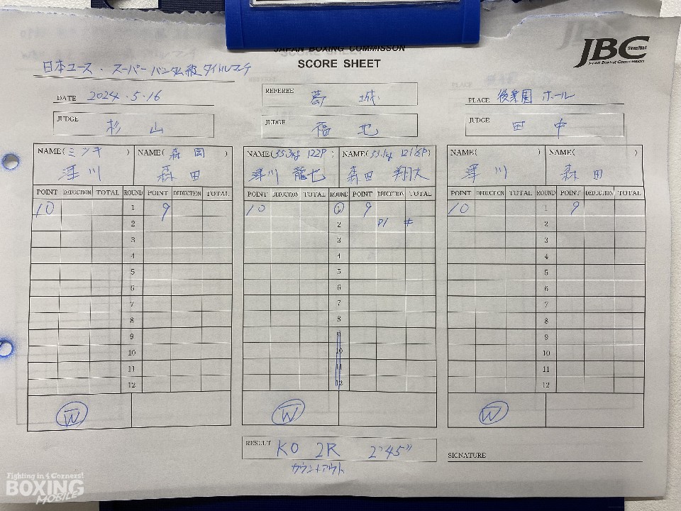 鋭く速いジャブでリズムを作った長身の津川に対して、出入りのボクシングで、距離を潰そうとした森田だったが、2回に左ボディから右ボディアッパーを、みぞおちに打ち込まれた森田が、前のめりに手をつくところに、間髪入れずに左ボディを叩いた津川がダウンを奪った。立ち上がった森田だったが、レフェリーは、10カウントを数え上げた。