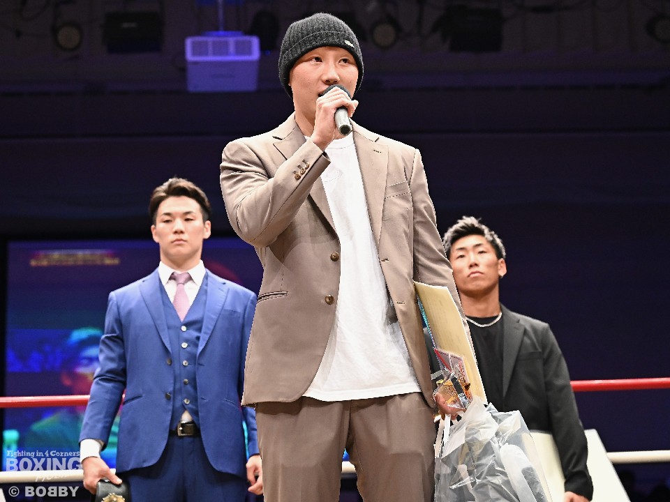殊勲賞に選出されたのは、日本スーパーフェザー級王者の奈良井翼(24=RK蒲田)。マイクを握った奈良井は、「次戦は選択試合だが、1位の選手を選んだ。スーパーフェザー級は層が厚い階級だが、どんどん強い選手に勝っていきたい」と抱負を語った。