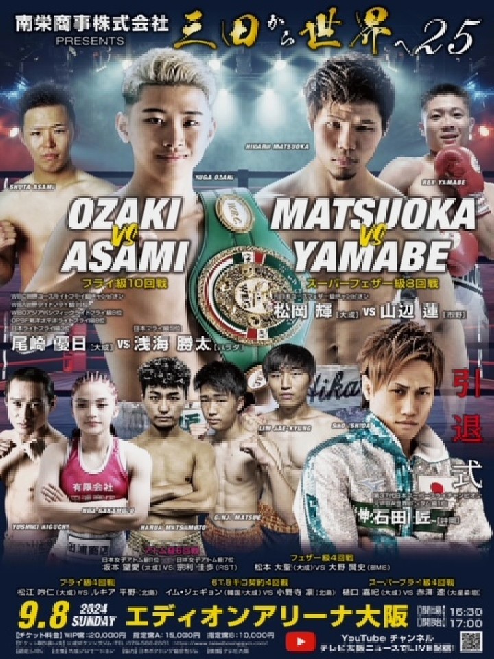 長月の陣も見逃せない。日本ライトフライ級ユース王者の尾崎優日(21=大成)が、フライ級10回戦で、日本フライ級5位の浅海勝太(29=ハラダ)と対決。9月8日(日)、エディオンアリーナ大阪のメインイベントだ。