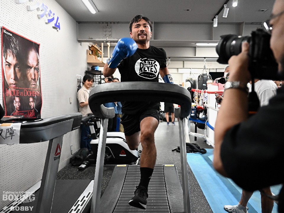 会見後には、シャドーボクシング、サンドバッグ打ち、ランニングマシンを全力疾走した後に、全力サンドバッグ打ちを披露。大声を上げながら強打を叩き込み、大粒の汗を流した。