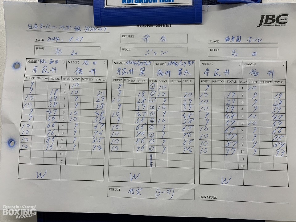 中間距離からカウンターを警戒しながら、中に入るタイミングを探る奈良井に対して、福井は右ストレートを見せて中に入れさせず。福井の打ち終わりに、奈良井は左フックをコンパクトに振り抜いた。5回終了後の採点は、ジャッジ2者が挑戦者を支持。6回には、福井が右ストレートをカウンターに合わせた。それでも、奈良井は冷静に距離を詰めて、ポイントをピックアップ。後半は、前に出てきた福井に手を出すタイミングを与えず。逆転判定勝利で、王座防衛に成功した。