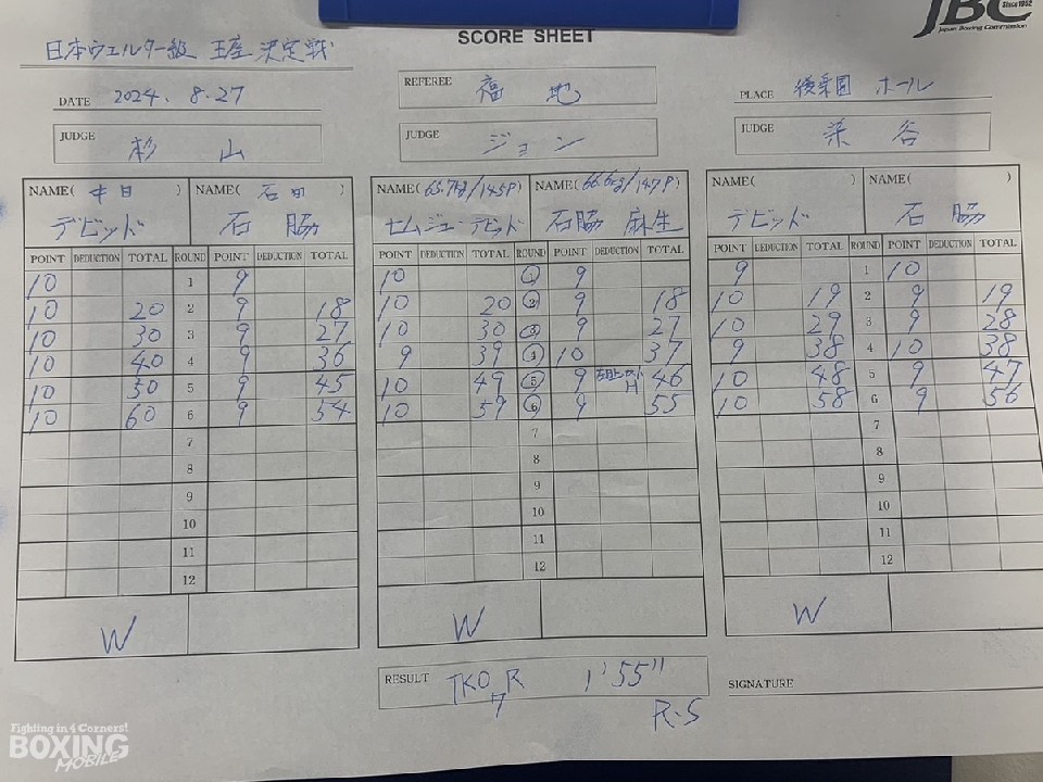 初回からデビットが上体を柔らかく使ってペースを作ると、対する石脇はプレッシャーをかけて、デビットが持つ独特のリズムの打開を狙った。パンチを広角に打ち分けて、細かく手数をまとめるデビットが、要所でポイントメイク。右フックで、石脇の左目上を切り裂いた。石脇も左を上下に散らして反撃にかかるが、テンポを崩す事ができず。試合が動いたのは7回。デビットが緩急をつけてフィニッシュを狙うと、石脇のダメージを見て取ったレフェリーが試合を止めた。