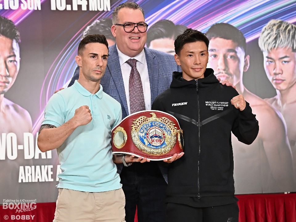 WBO(世界ボクシング機構)世界ライトフライ級王座決定戦に臨む岩田翔吉(28=帝拳)とハイロ・ノリエガ(31=スペイン)が11日、都内の東京ドームホテルで行われた「Prime Video Boxing 10」の合同記者会見で顔を合わせた。