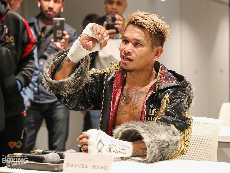大勢の陣営を引き連れて会見場に姿を見せたカシメロは「相手はダウンしたことがない選手だったので、1ラウンドから倒すつもりでいった。ハードワークをしてきたので、スタミナの不安はなかった」と試合を振り返った。