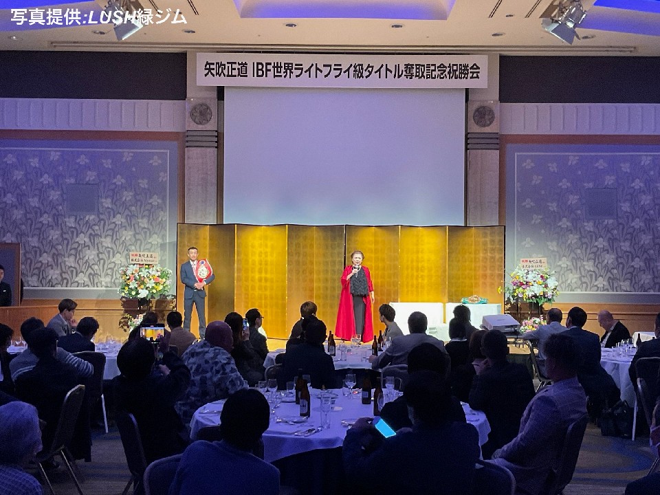IBF(国際ボクシング連盟)ライトフライ級王者の矢吹正道(32=LUSH緑)のタイトル奪取記念祝勝会が23日、ANAクラウンプラザホテルグランコート名古屋で盛大に開催された。このイベントには142名が出席し、矢吹の華々しいベルト獲得を祝う雰囲気で会場は熱気に包まれた。
