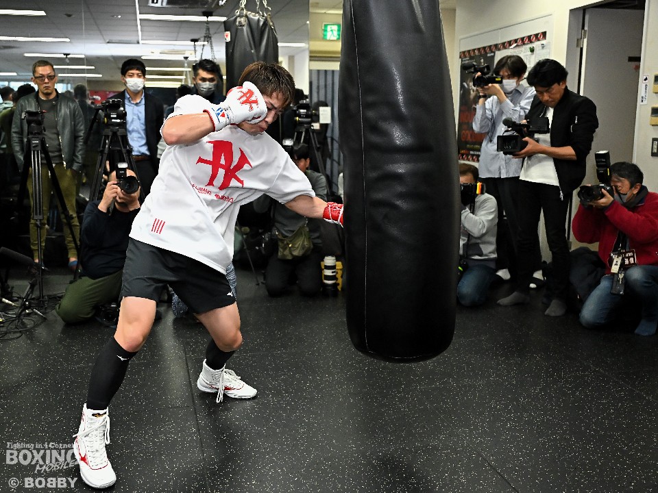 この日は、100人を超える報道陣を前に、シャドー2ラウンドの後、サンドバッグも2ラウンド叩いた。シャドーでは、ジャブと左フックとワンツーを丁寧に、そして、力強く振り抜いた。