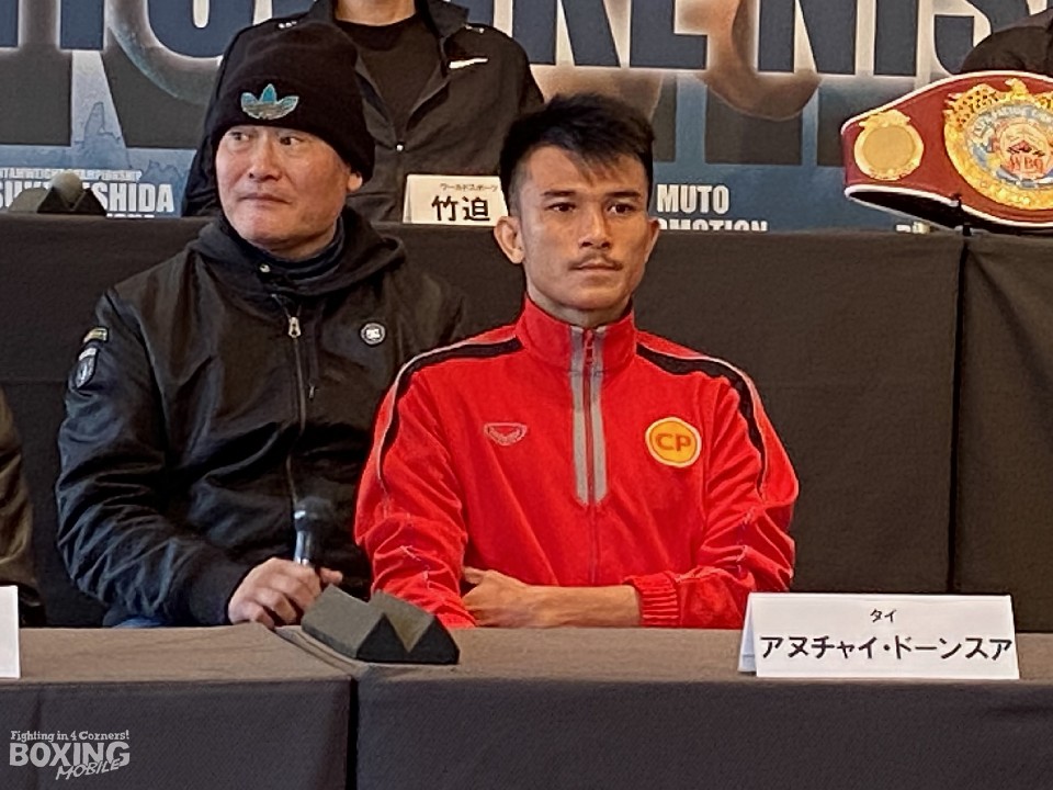 初の世界タイトルマッチに臨むアヌチャイは、「ニシダの顔を見て、ベルトを奪う気持ちが高まった。チャンスをもらえたことが本当にうれしい。自分がやるべきことをやるだけ。いつも以上に手数を出し、全力で戦う」と静かに闘志を燃やした。口数は少ないが、内に秘めた闘志を感じさせた。