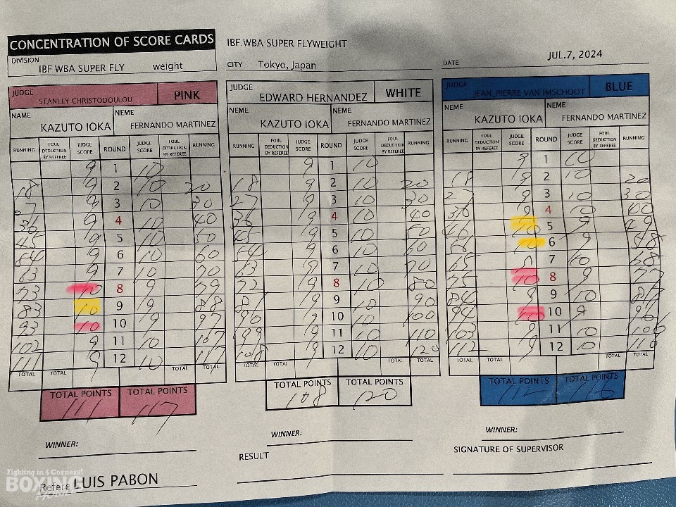 2人が対戦した今年7月の試合の採点表を見直すと、興味深い事実が浮かんでくる。3人のジャッジの内、1人はフルマークでマルティネスを支持しているため、参考にならないが、残る2人のジャッジは、分析してみる価値がある。