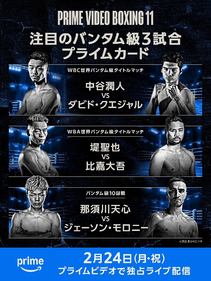 ダビド・クエジャル(23=メ)を挑戦者に迎えて、3度目の王座防衛戦に臨む中谷の試合を含む、2月24日(月・休)に開催される「Prime Video Boxing 11」の前売り券の発売は、1月11日(月)18時に開始される。ローソンチケットのウェブを要チェック!