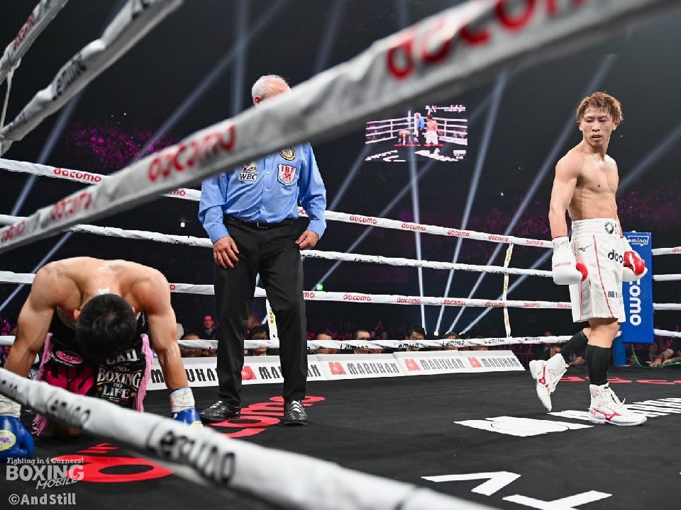 近い距離で始まった試合、井上は様子を見ながらジリジリとプレスをかけた。初回、サウスポーのキムも前に出る場面もあった。2回にキムがジャブ2発の後に左ストレートを井上の顔面にヒットした。試合が決まったのは4回、モンスターの左ボディから右ストレートでキムが倒れた。