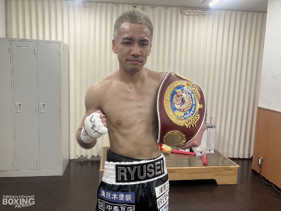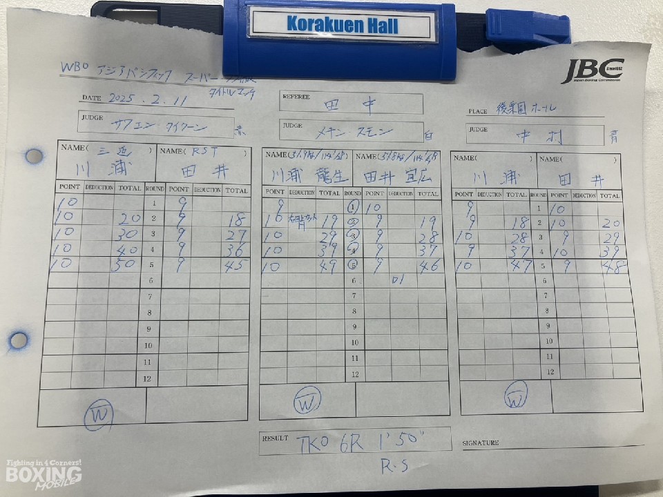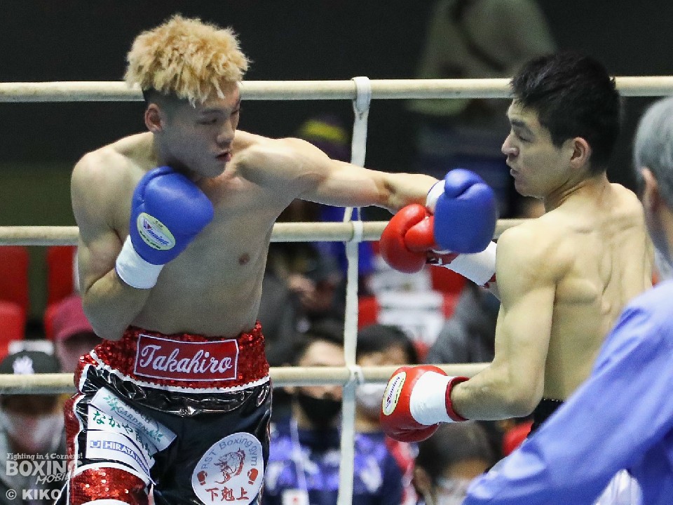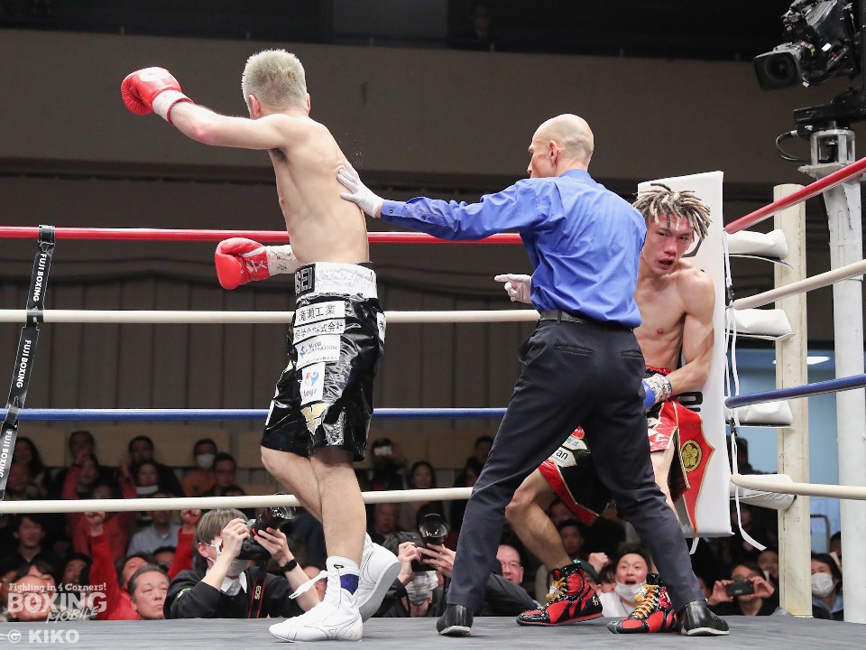 序盤は、挑戦者の田井がサウスポーからオーソドックスにスムーズにスイッチすると左ボディ、右オーバーハンドを叩きつけて先制攻撃。ヒッティングで右目上をカットしたサウスポー川浦だが、ガードで被弾を最小限に抑えると、カウンターの右フックで応戦。思い切りの良いパンチを振ってくる田井と、カウンターを打ち込む川浦の構図で、ヒリヒリする展開が続いた。3回になると川浦のワンツーが冴えてくる。距離をキープしながら左ストレートで顔を弾くと、6回に連打でロープダウンをゲット。再開後、怒涛の連打でレフェリーストップ勝ちした。