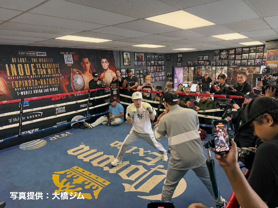 ジムに到着早々、挑戦者のラモン・カルデナス(29=米国)と初対峙し、写真撮影を行った。米記者グループと日本人記者グループに分かれて、各10分程度の囲み取材に応じると、記者が囲むリング上で、バンテージを巻いて、シャドー、ミット(太田光亮トレーナーと)、サンドバッグを各1ラウンド披露して、公開練習を終了した。