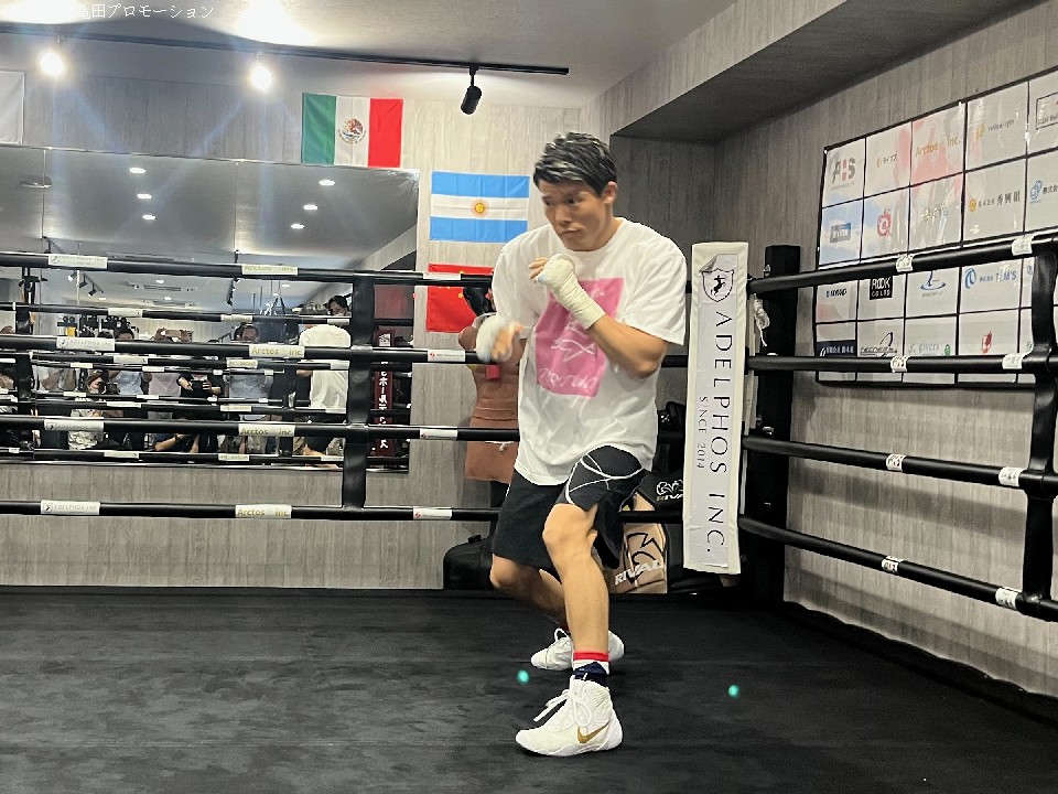 この日は、シャドーボクシングから、ドラムミット、通常のミット打ちと公開練習 に集まった報道陣に練習を惜しみなく披露し、いつもと変わらぬスピード感抜群の動き に加えて、重厚さを増したパンチをトレーナーのミットに打ち込んだ。