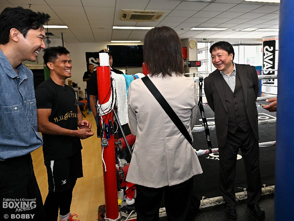 公開練習を終えたユッタポンと笑顔で握手した大橋秀行会長は、「蹴りがあれば勝つ自信はある?」と、通訳の方を介して質問すると、「プロなので勝ちます」と、ユッタポンも笑顔で答え、これに大橋会長は「武居は自信がないって言ってました」と、ムエタイの元ラジャダムナムチャンピオンへのリスペクトを伝えた。