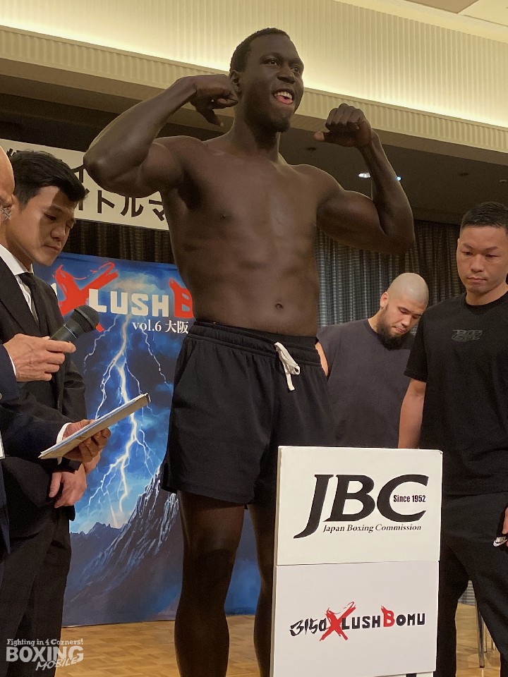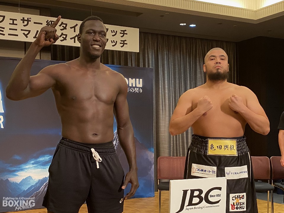 14戦目のリングに上がる但馬は、明日(24日)、インテックス大阪で開催される「3150×LUSHBOMU vol.6」ヘビー級8回戦でハーバード・マトヴ(30=ウガンダ)と対戦する。計量後のフェイスオフでは頭をつけて睨み合い、お互いに戦闘態勢に入っていた。